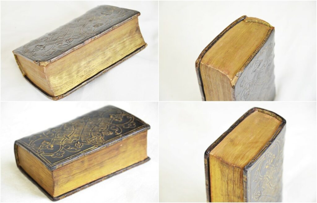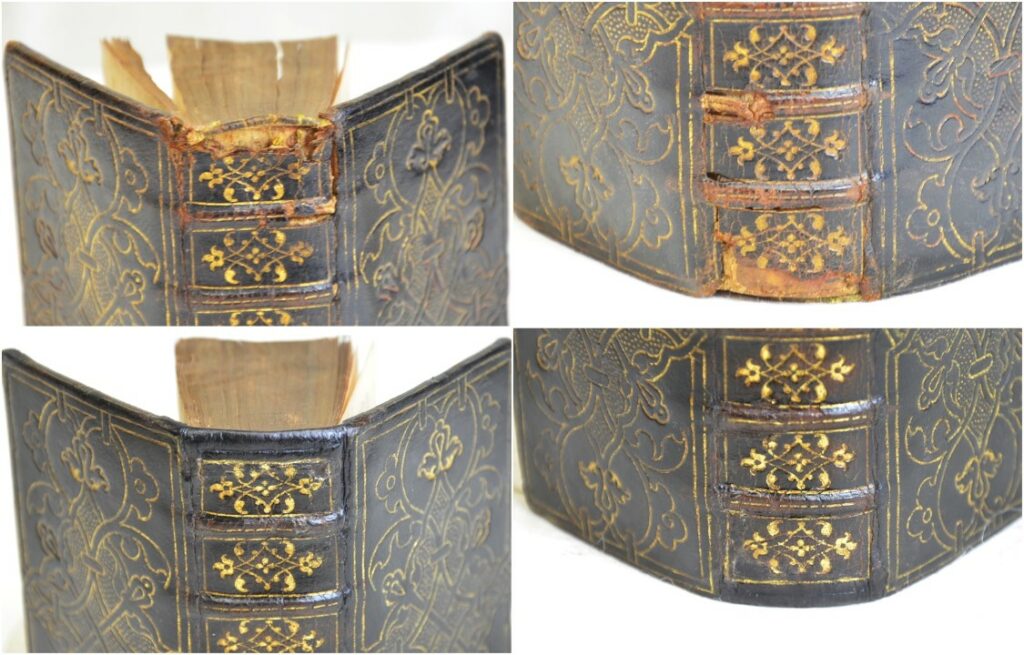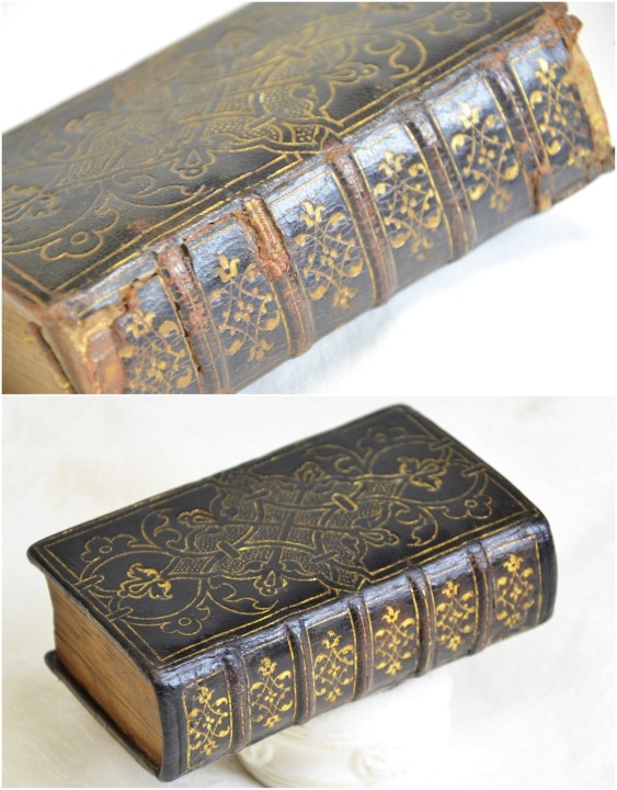 Seconde belle reliure en maroquin noir à décor doré d’entrelacs géométriques et de fers et fleurons aldes . caractéristiques de l’atelier du relieur de Salel.