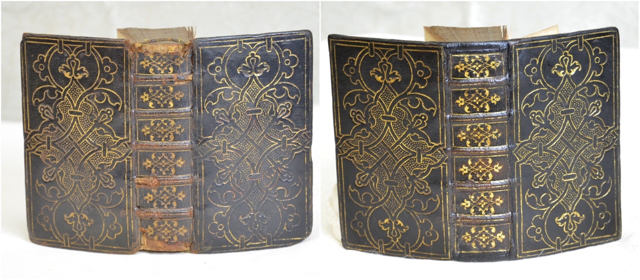 Seconde belle reliure en maroquin noir à décor doré d’entrelacs géométriques et de fers et fleurons aldes . caractéristiques de l’atelier du relieur de Salel.